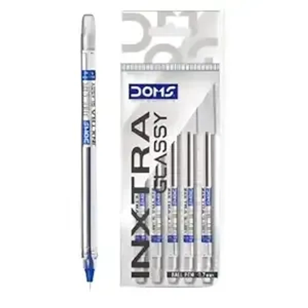 Doms Inxtra Glassy 0.7mm Ballpen-Pack Of 5 -Blue Ink| Transparent Clear Body| Comfortable Grip For Smooth & Long Writing| Non-Fading & Smudge Free, Quick Dry, Lightweight, Pocket Clip