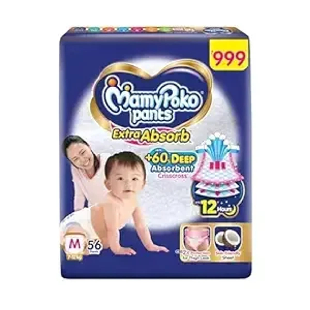 MamyPoko Pants Extra Absorb Baby Diapers, Medium (M Size) | 7-12 kg | 56 Count