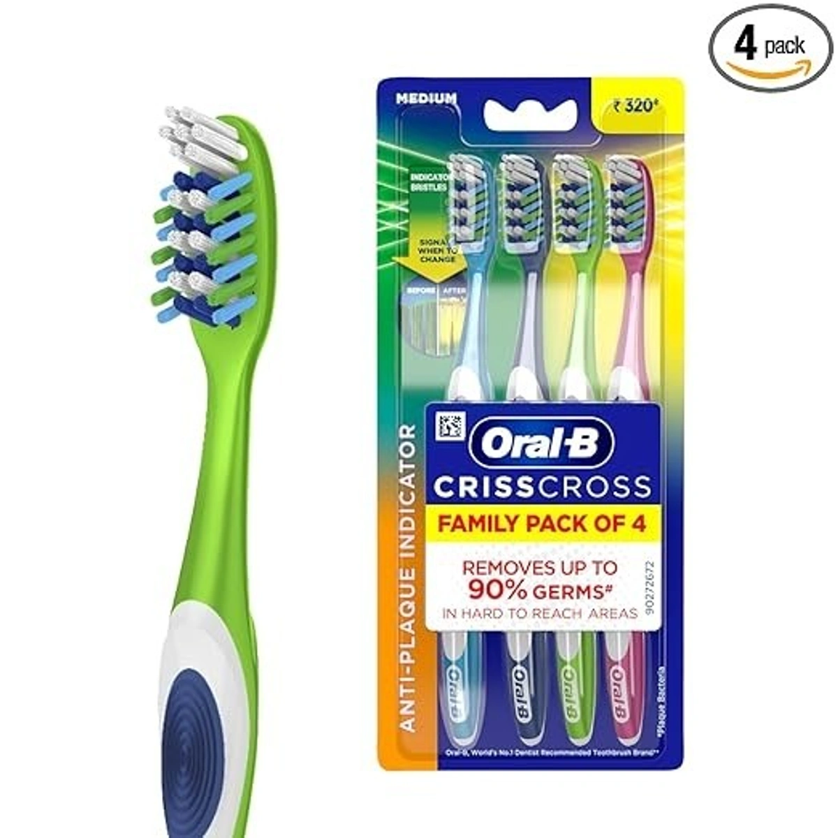 Oral-B Criss Cross Toothbrush For Adults,Tongue Cleaner, Tooth Brush Set, (Family Pack of 4)