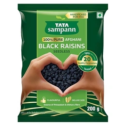 Experience the wholesome goodness of Tata Sampann 100% Pure Afghani Black Raisins, also known as Kali Kishmish. These seedless black raisins are sourced from the finest Afghani farms, ensuring premium quality in every bite. Perfectly dried and naturally sweet, they are a delicious and nutritious addition to your daily diet.