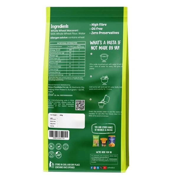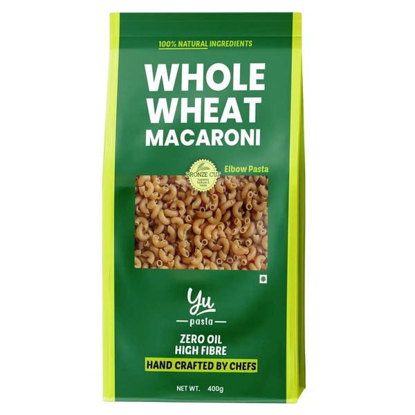 Yu Foodlabs 100% Whole Wheat Pasta - Macaroni - High Fibre - Zero Preservatives - No Maida & 100% Atta - Just Boil - 400 G - Yu